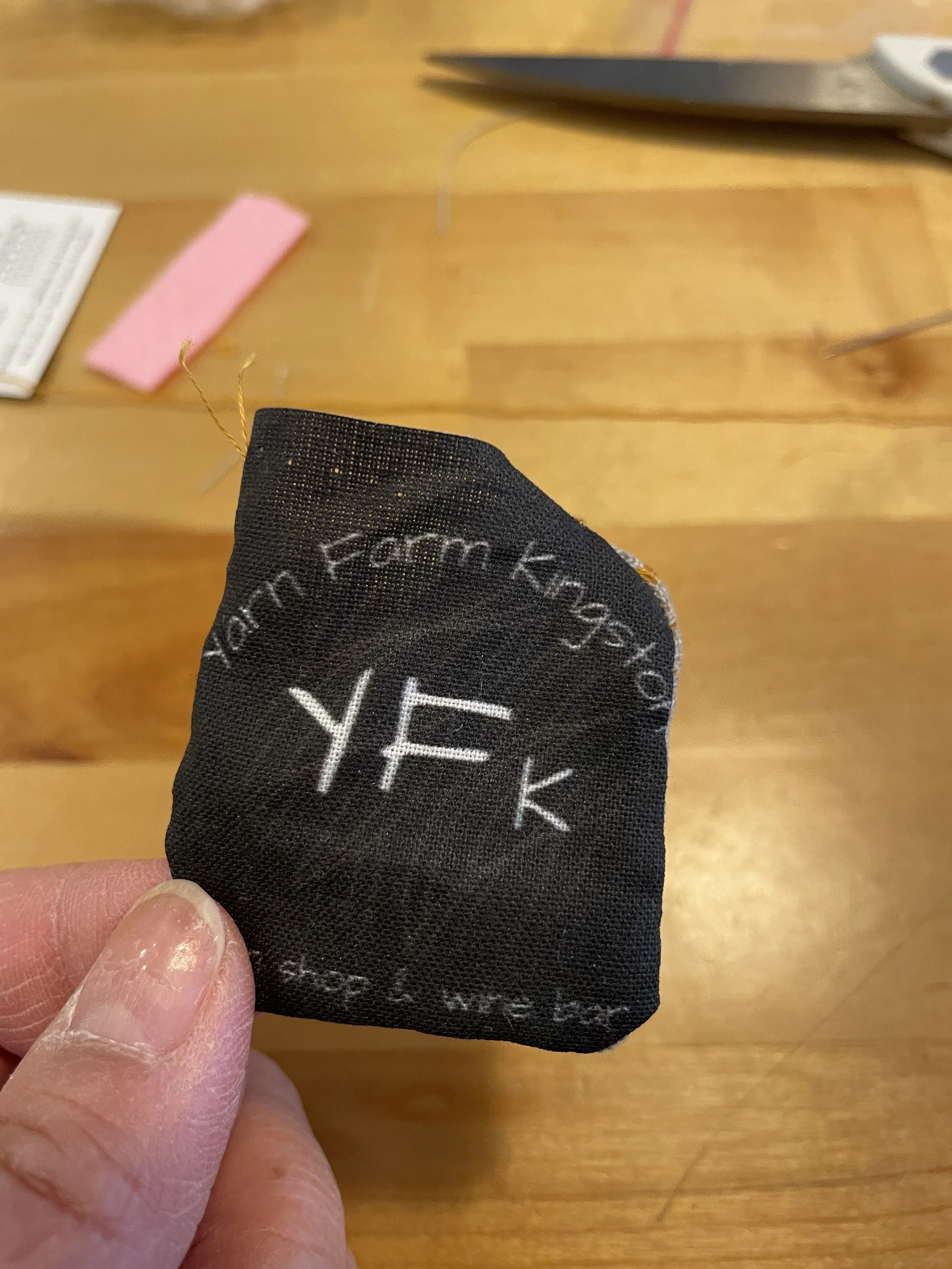 Or, on one side of the piece you could sew on a safety pin and you could make your project into a soft brooch, with either the YFK logo side out, or the embroidered side out.